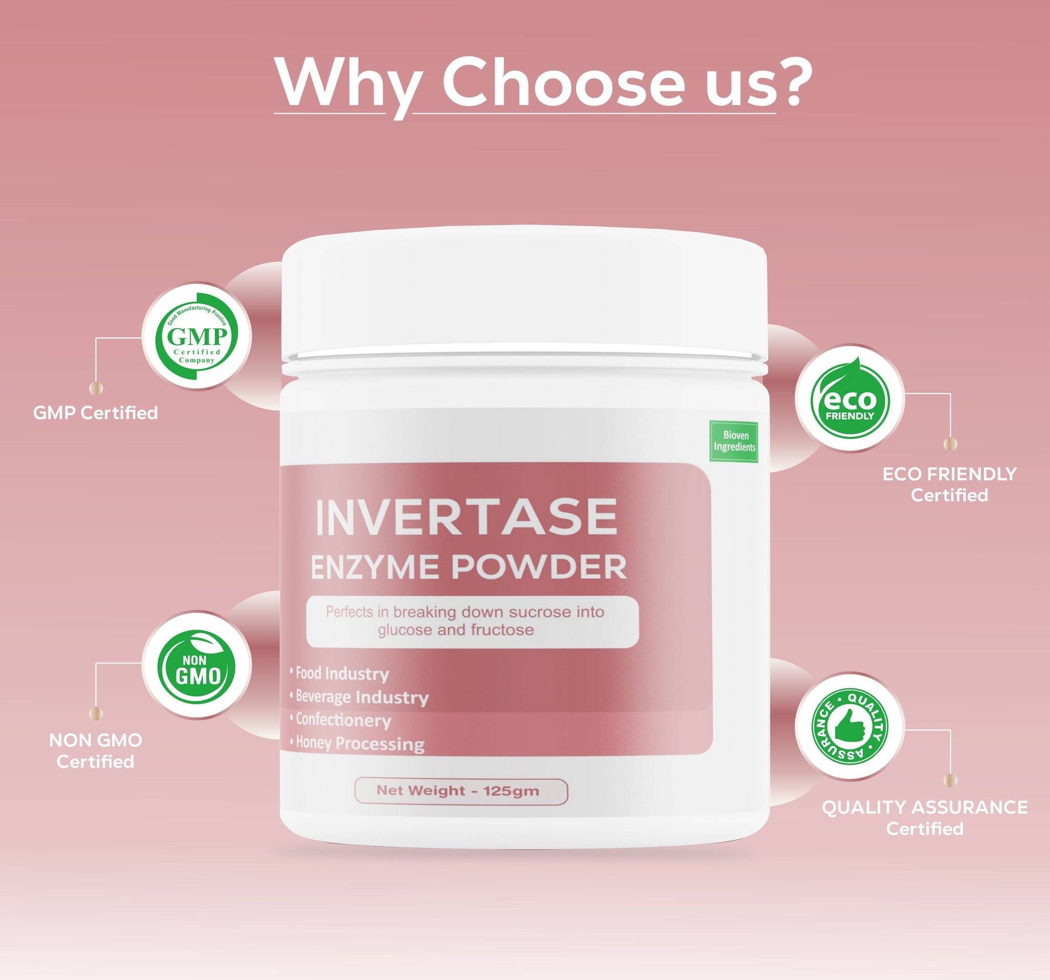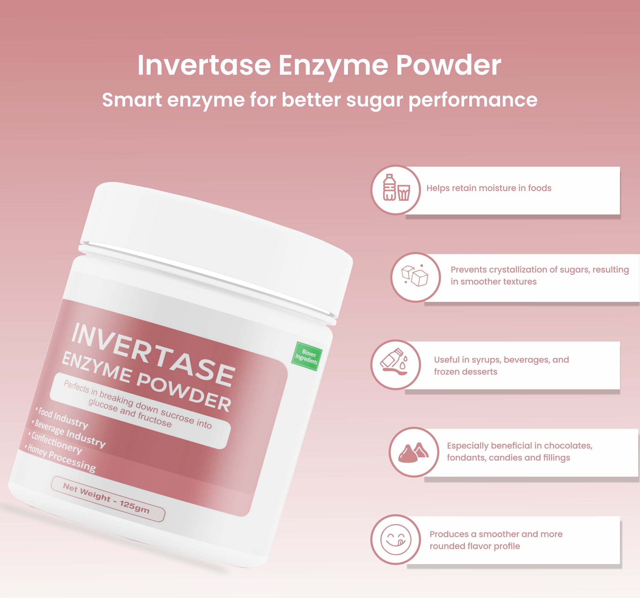 الوصف: يُعرف إنزيم الإنفرتاز أيضاً باسم بيتا-فروكتوفورانوسيداز، وسكراز، وجلوكوسكراز، وإنفرتين، وفروكتوزيل إنفرتين، وغيرها. يوجد هذا الإنزيم بكثرة في النباتات والكائنات الدقيقة، ويساهم في تنظيم عمليات الأيض، بالإضافة إلى دعم النمو والدفاع. يُستخلص إنزيم الإنفرتاز في الغالب من خميرة الخباز المعروفة باسم Saccharomyces cerevisiae.