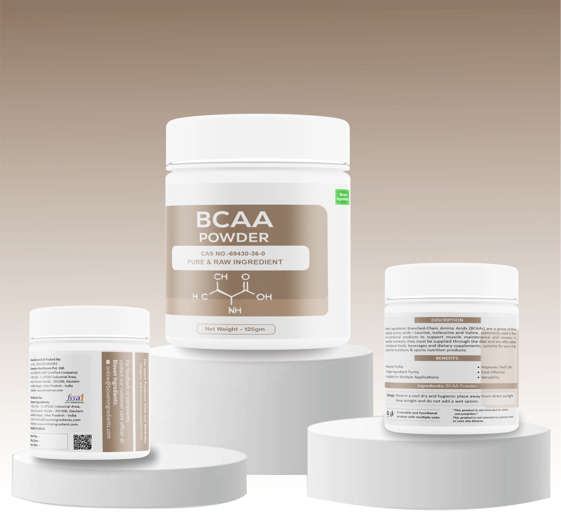 Bioven Ingredients is the Leading Supplier of BCAA (Branched-Chain Amino Acids ) An Essential Amino Acids (EAAs) that are a group of three essential amino acids, Leucine, Isoleucine and Valine, which is essential, because they can't be produced by our body , that is why it is obtained from food. The Raw BCAA (Branched-Chain Amino Acids) that helps to build muscle, decrease muscle fatigue and muscles soreness. The 100% Pure BCAA (Branched-Chain Amino Acids) helps to stimulate the building of protein in muscle and possibly reduce muscle breakdown. We Export BCAA (Branched-Chain Amino Acid) for more than 25+ countries by which we are known as a Global Supplier, Distributor & Exporter of BCAA (Branched-Chain Amino Acid).
