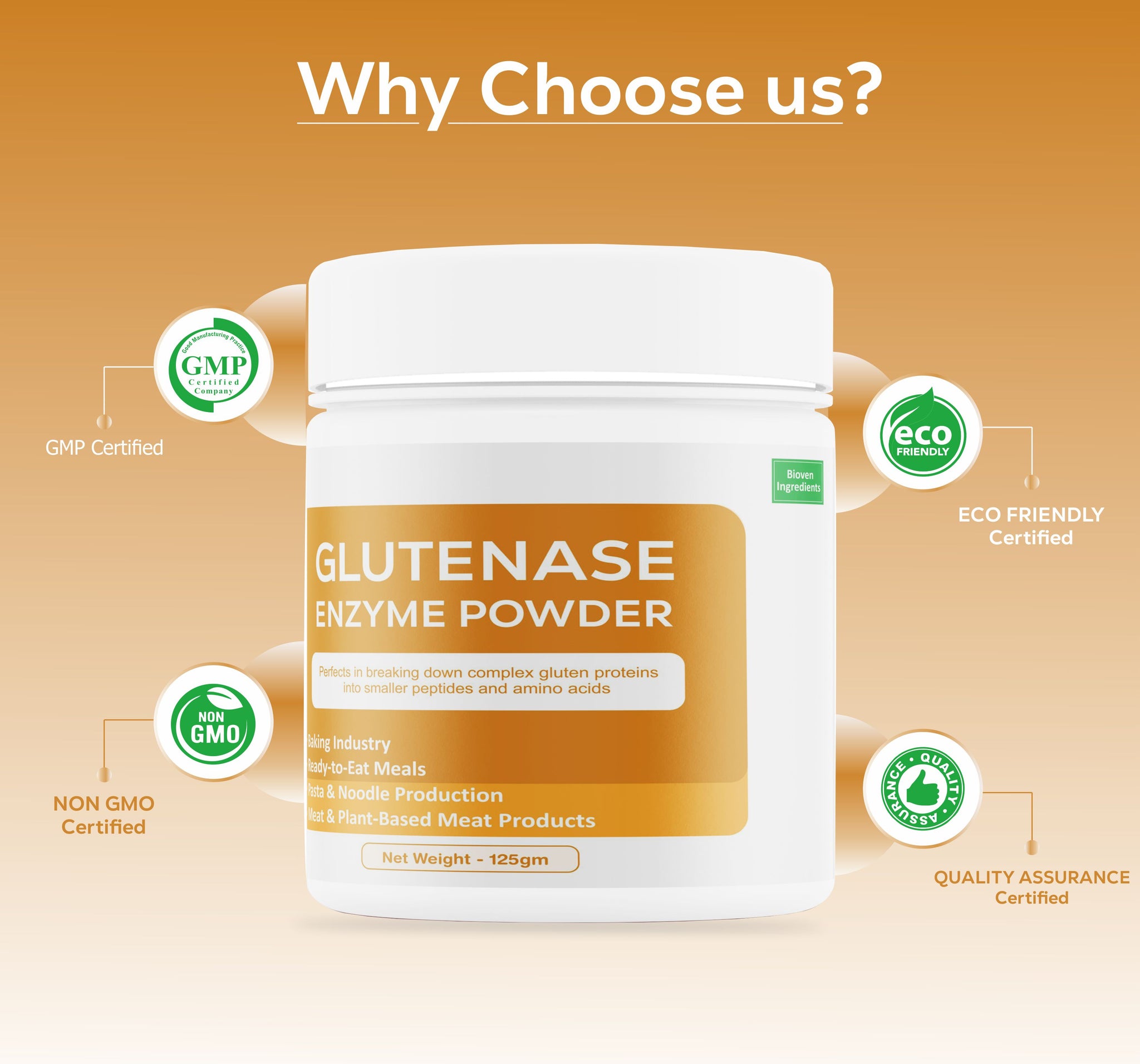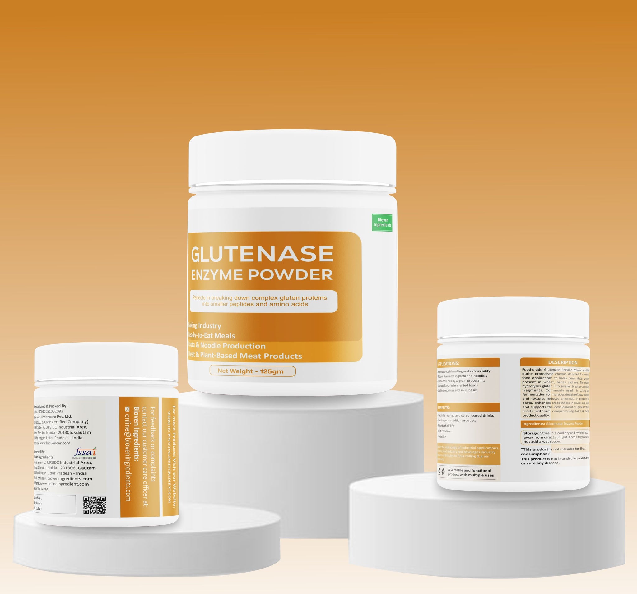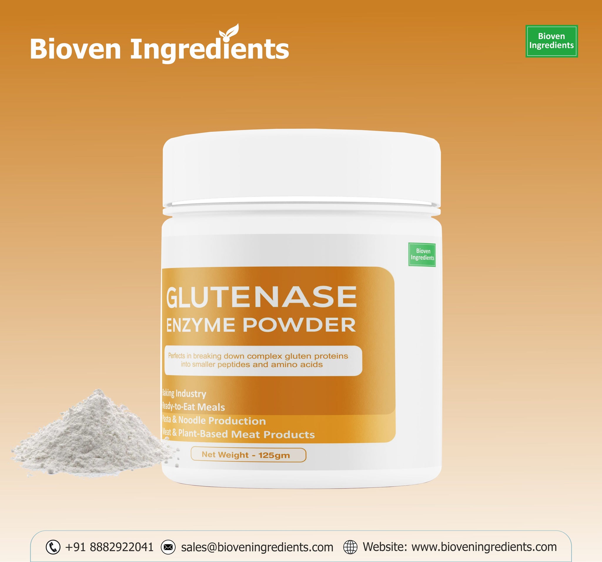 Bioven Ingredients is the leading manufacturer and supplier of Glutenase Enzyme Powder. This enzyme is safe for food and is used in the food industry to break down gluten proteins that are found in wheat, barley and rye. It helps lower the amount of gluten in food by breaking specific parts of the gluten molecule, which makes the proteins easier to digest or remove. It is often used in baking, cereal products, and fermented foods. The enzyme is made through a process called microbial fermentation and works best when the temperature is moderate and the environment is slightly acidic.