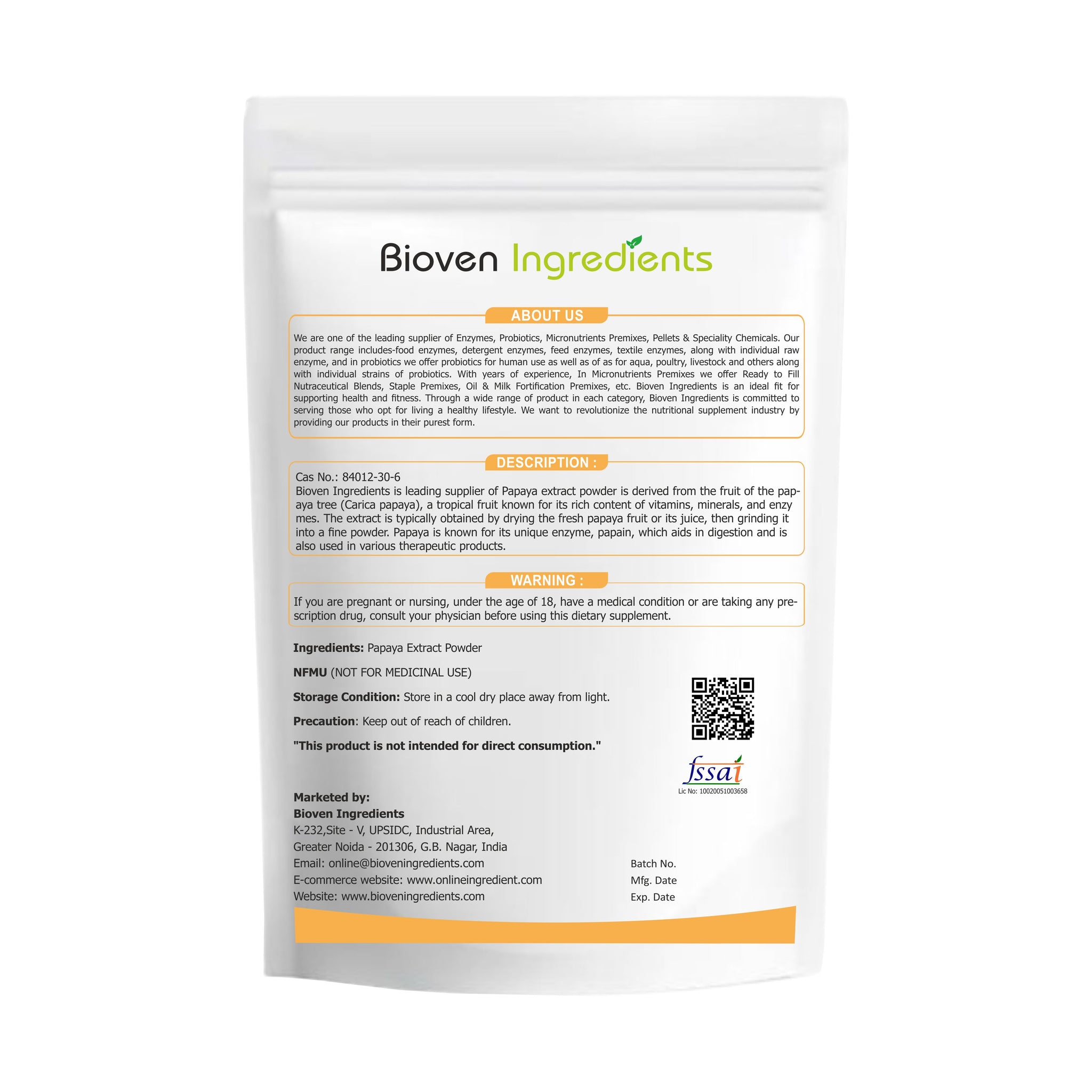 Bioven Ingredients is leading supplier of Papaya Extract Powder. Papaya extract powder is derived from the fruit of the papaya tree (Carica papaya), a tropical fruit known for its rich content of vitamins, minerals, and enzymes. The extract is typically obtained by drying the fresh papaya fruit or its juice, then grinding it into a fine powder. Papaya is known for its unique enzyme, papain, which aids in digestion and is also used in various therapeutic products. This powder often retains many of the fruit’s beneficial properties, including vitamins A, C, E, and various antioxidants, making it a popular ingredient in dietary supplements, cosmetics, and natural health products. Papaya extract powder is a versatile product that offers various health benefits, from supporting digestion and immune health to enhancing skin and hair care routines.