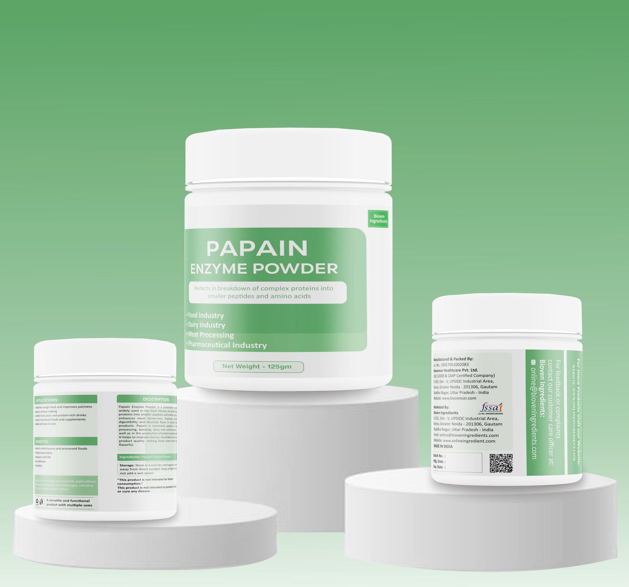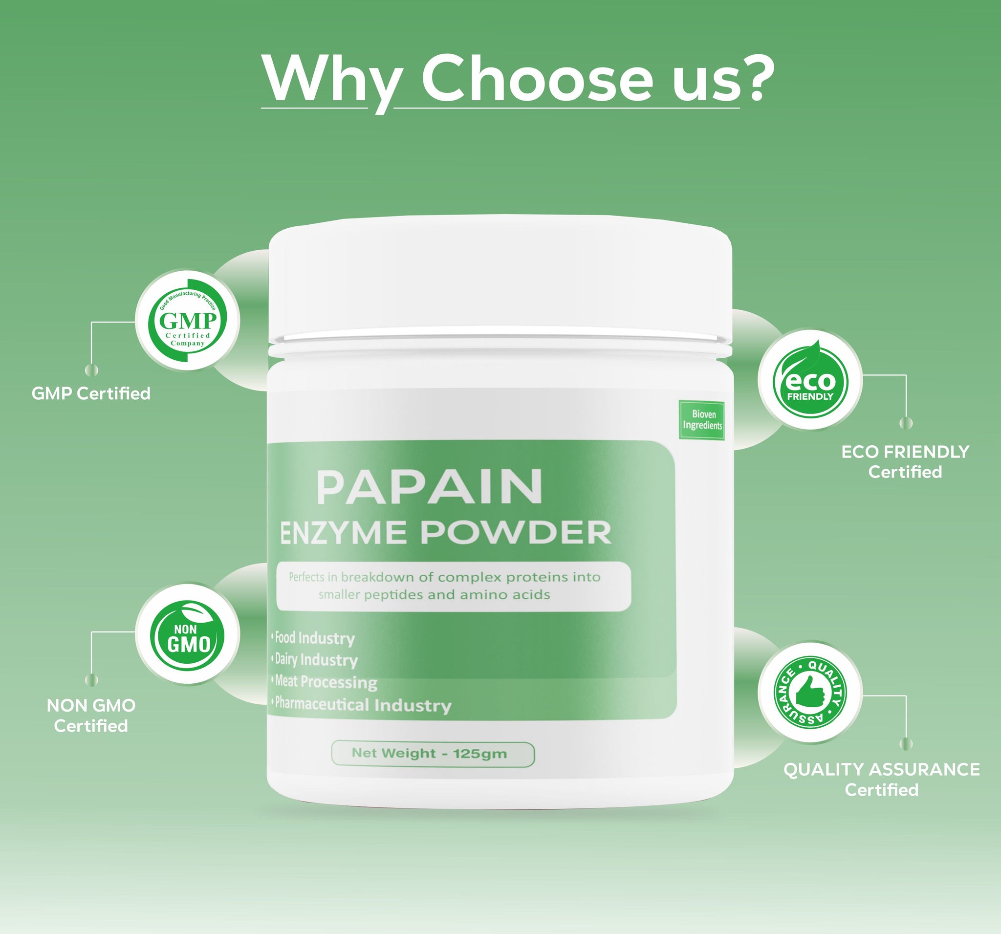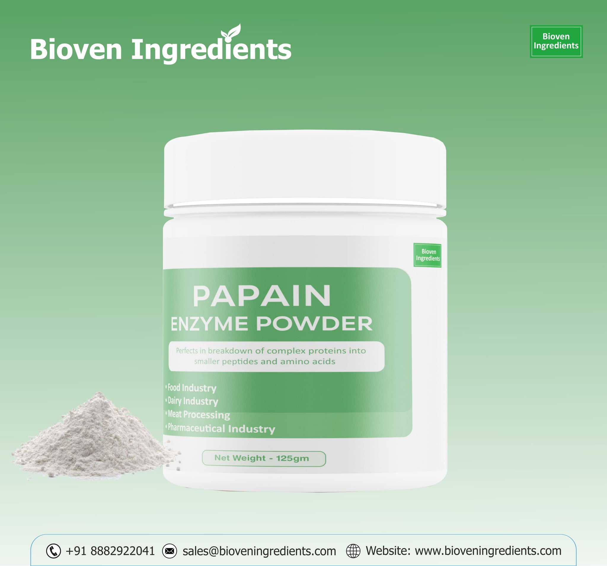 Description: Bioven Ingredients is one of the leading supplier and distributor of Papain Enzyme. Papain is a type of protease enzyme which breaks the peptide bonds of large proteins and converts them into smaller chains of peptides or amino acid. Papain is commonly used as a meat tenderizer, as it helps to break down the collagen and other proteins in meat, making it more tender and easier to chew. Papain is used mainly in the food industry in tenderizing the meat as it acts on the structural component of muscles. It is also used in cosmetics, toothpaste, and sometimes the medical industry. Bioven Ingredients is the global supplier & exporter of Papain Enzyme.