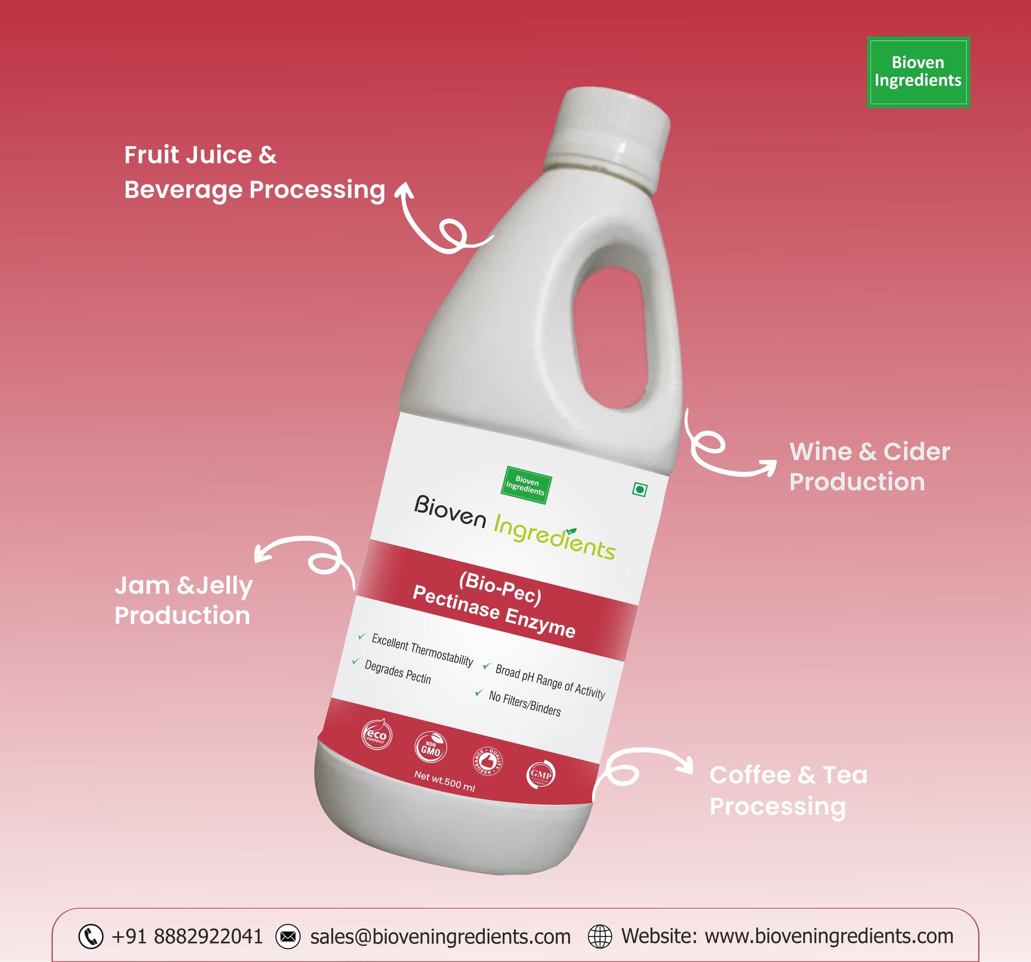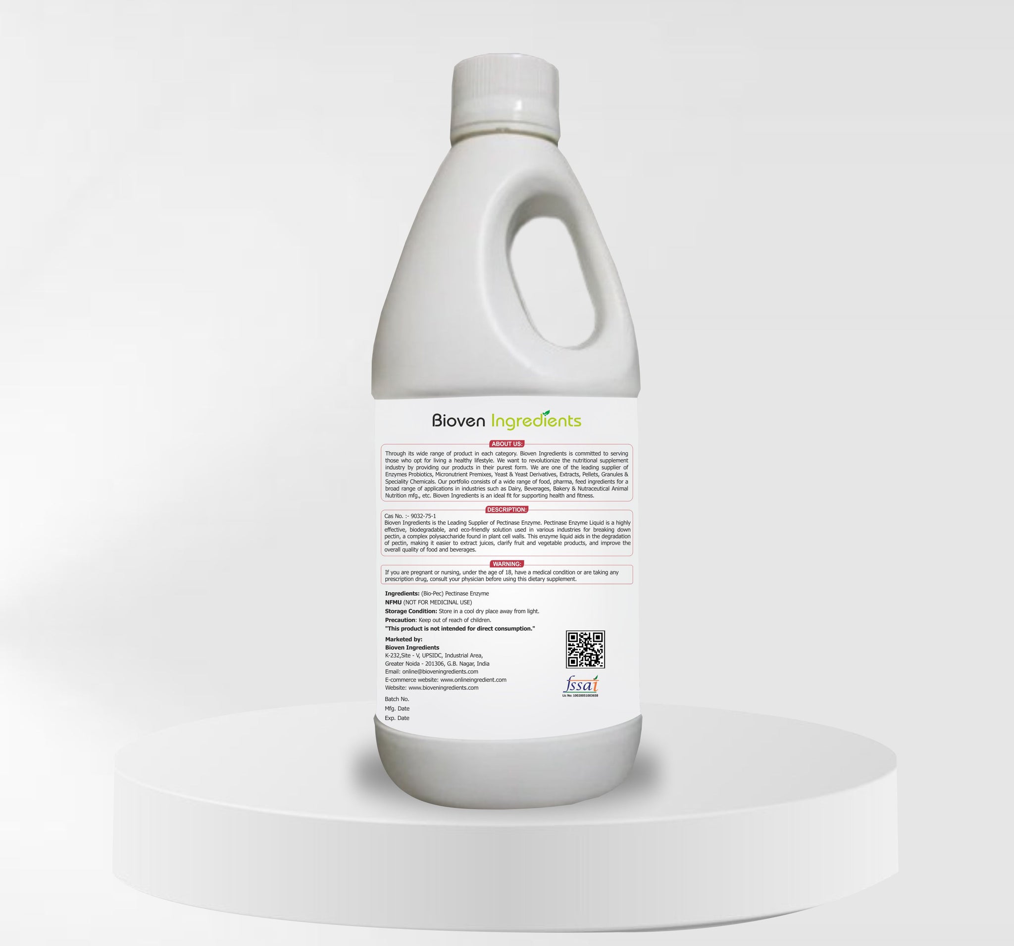 Bioven Ingredients is the leading supplier of Pectinase Enzyme Liquid. Our premium Pectinase Enzyme Liquid is a highly effective, biodegradable, and eco-friendly solution used in various industries for breaking down pectin, a complex polysaccharide found in plant cell walls. As a trusted supplier of Pectinase Enzyme Liquid, we offer high purity pectinase enzyme Liquid with high thermostability enzyme. This enzyme liquid helps in the degradation of pectin, making it easier to extract juices, clarify fruit and vegetable products, and improve the overall quality of food and beverages.